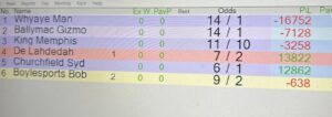 Next up, yes,we’re still going… a bet of £12,000 – £3000 Never Say No was unexpected but of course had the potential to bugger the day. At the off the same dog was losing £10,000. The favourite won, the book copped £2000, topping up the night.