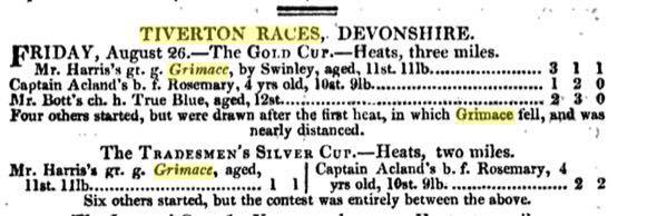 Well that wasn’t quite it, as mentioned at the head of the story, the internet is a wonderful tool. A reader contacted me to say that he’d found the race on-line, it took place on 26th August 1825 and is recorded in the wonderfully titled ‘Sporting Magazine: Or, Monthly Calendar of the Transactions of the Turf, the Chase and Every Other Diversion Interesting to the Man of Pleasure, Enterprize, and Spirit’ (Now who could resist subscribing to that were it published today?!) So the race happened and Grimace fell in one of the heats. Who was that punter? We still don’t know and as Jack (RIP) advised I think he should still be left be, but I just hope that, whoever he was, his surname wasn’t Nott!